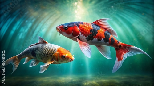 Naklejka premium Majestic Red and Black Koi Fish in Pond - Rule of Thirds Composition