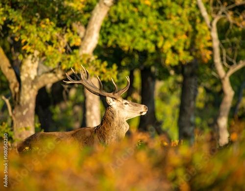 Naklejka premium Majestic red deer stag in autumnal woodland, sunlight illuminating its...