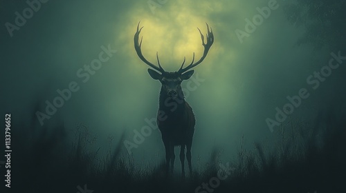 Obraz premium Majestic red deer stag silhouetted against a misty, moonlit forest background.