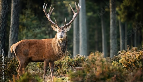 © netsay, Naklejka premium Majestic Red Deer Stag Standing in Lush Forest A Vivid Portrait of Wildlife and Natures Beauty, Captured on a Winters Afternoon