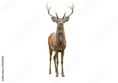 © Matteo, Obraz premium Majestic red deer stag with large antlers isolated PNG, standing tall and proud on transparent background