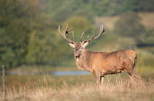 © giedriius, Fototapeta premium Majestic red deer stag with large antlers standing in a meadow