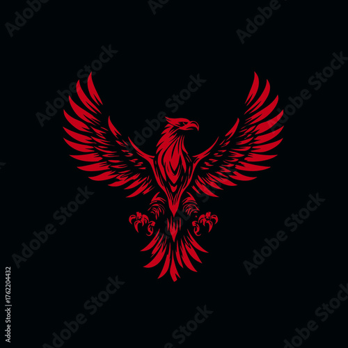 © Aril, Fototapeta premium Majestic red eagle or phoenix with spread wings on black background, symbolizing strength, freedom, and triumph. Powerful mythical bird.