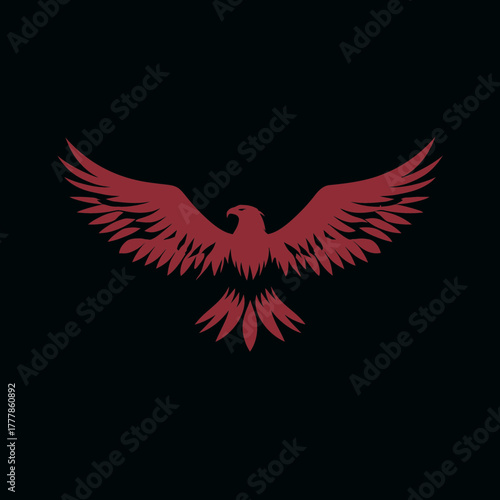 © Dyrendwi, Fototapeta premium Majestic red eagle silhouette flying with wings spread against a dark background, symbolizing power, strength, and freedom. Graphic design element.