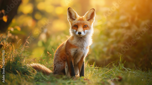 © Volodymyr, Obraz premium Majestic red fox in golden sunlight, sitting gracefully in a lush forest, perfect for wildlife blogs, nature photography websites, and environmental awareness campaigns