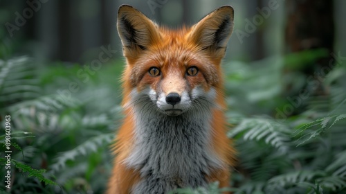 Obraz premium Majestic red fox is standing in a lush green forest, its piercing gaze captivating the viewer