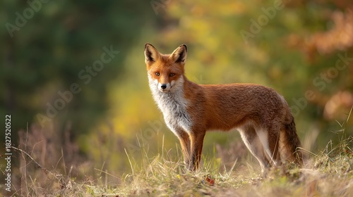 Fototapeta premium Majestic red fox portrait captures a serene autumn moment on a forest edge bathed in golden light