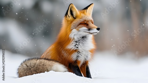 © Thatsanee Techakaew, Fototapeta premium Majestic red fox sitting gracefully in the fresh, soft snowy landscape of winter wilderness