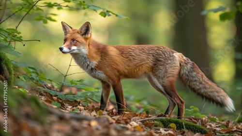 Fototapeta premium Majestic red fox standing alertly in a lush green forest surrounded by autumn...