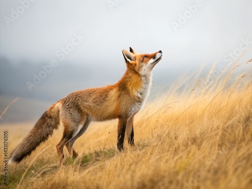 © Attala Rizky, Fototapeta premium Majestic Red Fox Standing in a Serene Field with Its Head Raised Toward the Sky