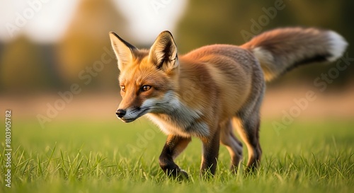 © KULSUM, Fototapeta premium Majestic Red Fox Walking Through Grassy Field at Sunset