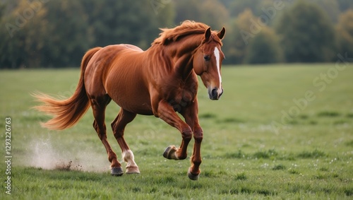Fototapeta premium Majestic Red Horse Galloping Freely Across Lush Green Field Under Clear Sky...