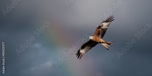 © Andrii Zastrozhnov, Fototapeta premium Majestic red kite soaring against a dramatic sky with rainbow backdrop