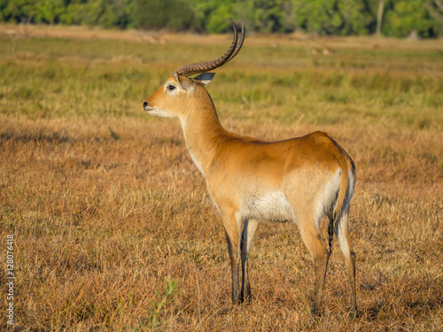 Naklejka premium Majestic red lechwe antelope bull with large antlers in savannah scenery, Moremi National Park, Botswana