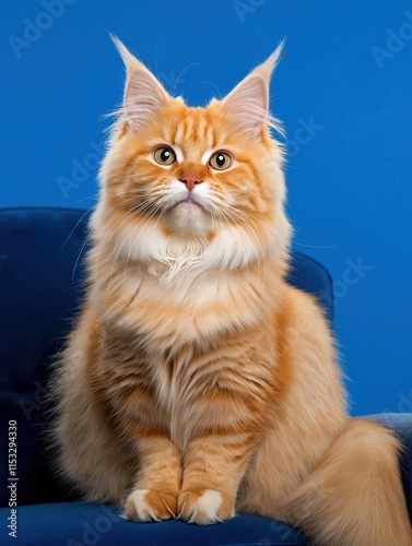 © rfassets, Obraz premium Majestic Red Maine Coon Kitten Posing on Blue Chair