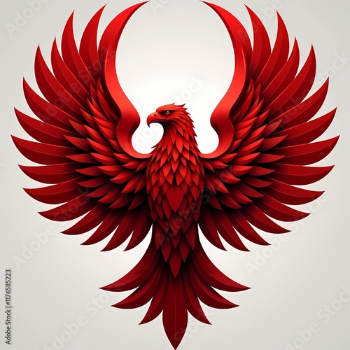 © Roman Stock studio, Obraz premium Majestic red phoenix with spread wings on a light background.