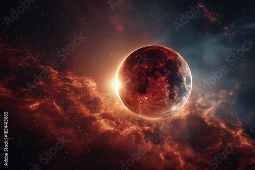 © RISHAD, Obraz premium Majestic red planet in space with glowing sunlight and starry background