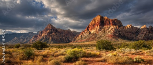 Fototapeta premium Majestic red rock mountains rise under a dramatic sky, casting long shadows...