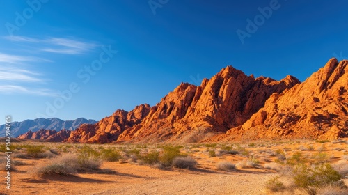 Naklejka premium Majestic Red Rock Mountains Under Clear Blue Sky with Sparse Vegetation in...