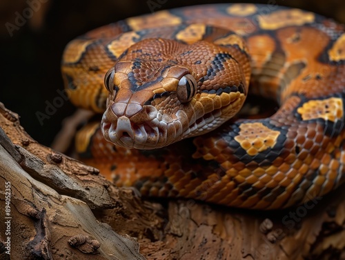 © frank29052515, Obraz premium Majestic Red-Tailed Boa Constrictor Coiled on a High Branch in the Wild Jungle