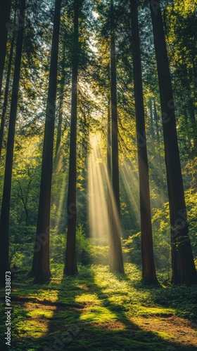 © jirayut, Fototapeta premium Majestic Redwood Forest: Sunlight Through Canopy