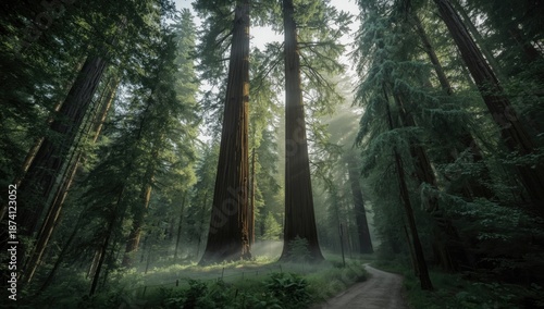 Fototapeta premium Majestic redwood forest with dense foliage and textured bark, highlighting...