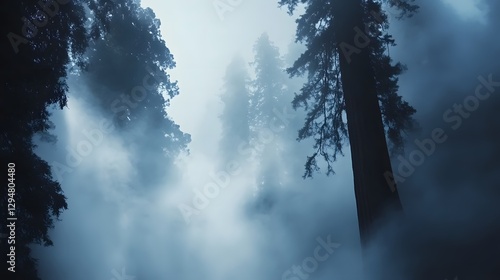 Naklejka premium Majestic redwood trees emerging from the thick fog