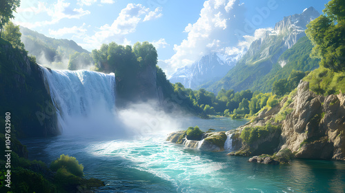 © Thiago, Fototapeta premium Majestic rhine falls cascade down rocky cliffside, misty veil rises from turquoise water, surrounded by lush greenery and sunny blue sky in switzerland. Misty Waterfall Basin. Illustration