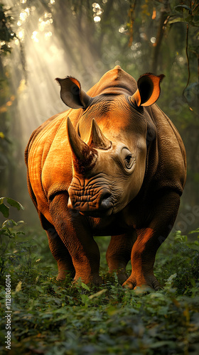Obraz premium Majestic rhino in sunlit forest, powerful, strong, wild animal.