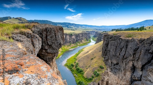 © Ratchanee, Obraz premium Majestic River Flowing Through Rocky Canyon Landscape in Daylight