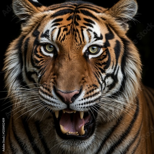 Naklejka premium Majestic Roaring Tiger with Striking Features, A fierce tiger with vibrant stripes and an intense expression, perfect for wildlife enthusiasts and art projects.
