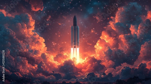 © muhammad, Fototapeta premium Majestic Rocket Launch: A Stellar Ascent Through Fiery Clouds