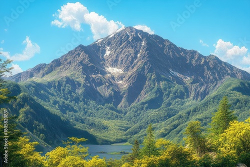 © Ulyana, Naklejka premium Majestic rocky mountain with snow patches rising above a green forested valley and small blue lake, yellow flowering trees in the foreground under bright blue sky, serene and awe-inspiring