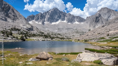 © Sampao, Naklejka premium Majestic rocky mountains towering over a calm blue lake reflecting the sky.