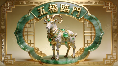 Fototapeta premium Majestic royal goat with jade ornaments, text " 五 福 臨 門 ", 3D gold emboss...