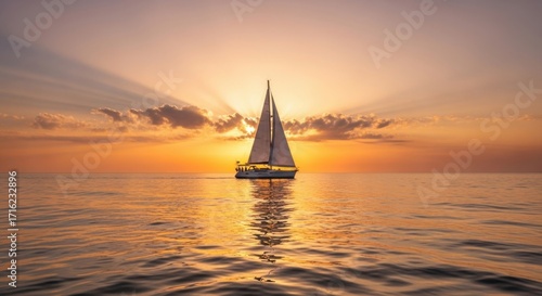 © Presetsly, Fototapeta premium Majestic Sailboat Glides Across Ocean During Golden Hour Sunset
