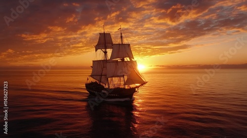 Obraz premium Majestic sailing ship gliding across calm waters at sunset with vibrant sky...