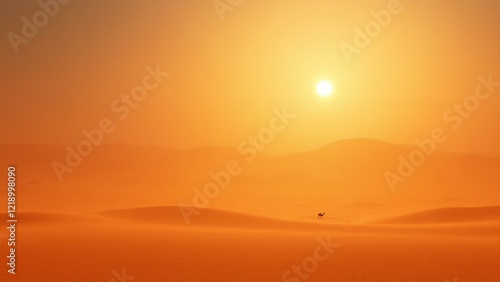 © Max Entropy, Obraz premium Majestic sand dunes meet the fiery desert sky with a solitary camel's path