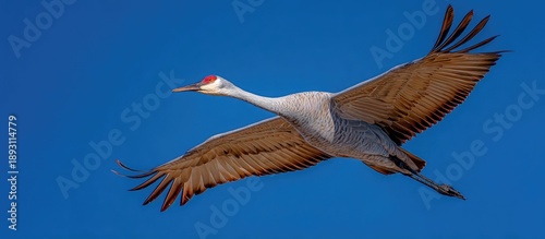 Naklejka premium Majestic Sandhill Crane Flying Across Clear Blue Sky