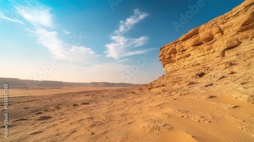 Naklejka premium Majestic sandstone cliff overlooking a vast, sandy desert under a bright blue...