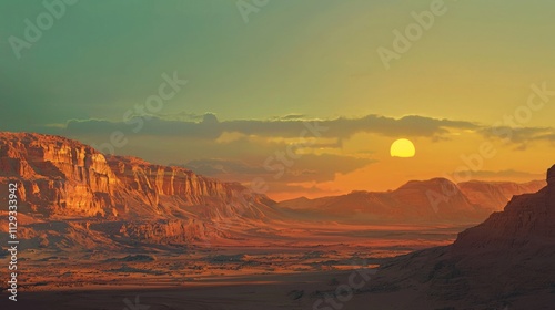 Fototapeta premium Majestic sandstone cliffs and a vast desert valley are bathed in the warm,...