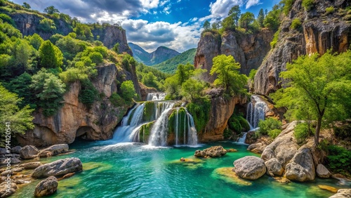 © Caitlin, Naklejka premium Majestic Sapadere canyon, surrounded by lush greenery, showcases cascading waterfalls amidst the rugged Taurus mountains, evoking serenity near Alanya, Turkey's ancient landscape.