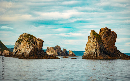 Fototapeta premium Majestic sea stacks rising from calm ocean water under a cloudy sky