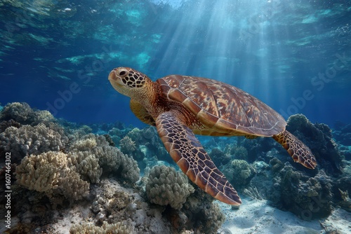 Obraz premium Majestic sea turtle glides gracefully through sunlit coral reef waters