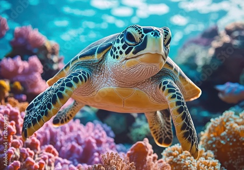 Fototapeta premium Majestic Sea Turtle Gliding Through Vibrant Coral Reef Under Clear Blue Ocean...