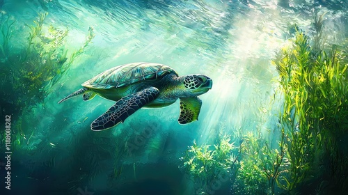 © Kitta Studio, Obraz premium Majestic Sea Turtle Gliding Through Vibrant Underwater Landscape