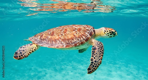 Obraz premium Majestic Sea Turtle Gracefully Gliding Through Crystal-Clear Turquoise Waters