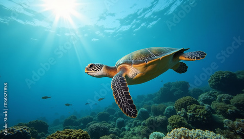Naklejka premium Majestic sea turtle gracefully gliding through vibrant coral reef amid sunlit waters