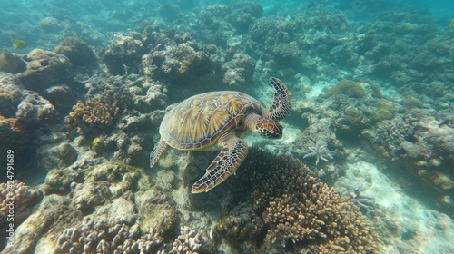Naklejka premium Majestic Sea Turtle Gracefully Navigating Vibrant Coral Reef