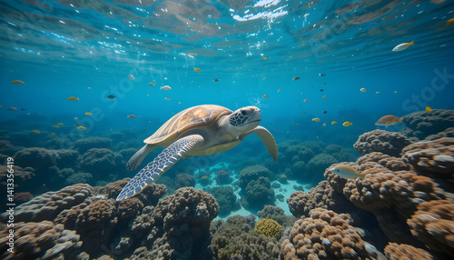 © Naureen, Fototapeta premium Majestic Sea Turtle Gracefully Swimming in Vibrant Coral Reef